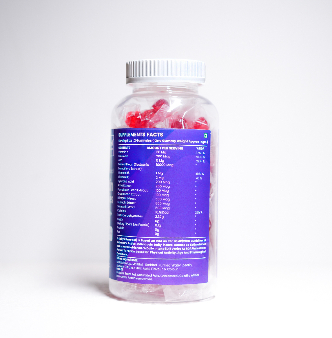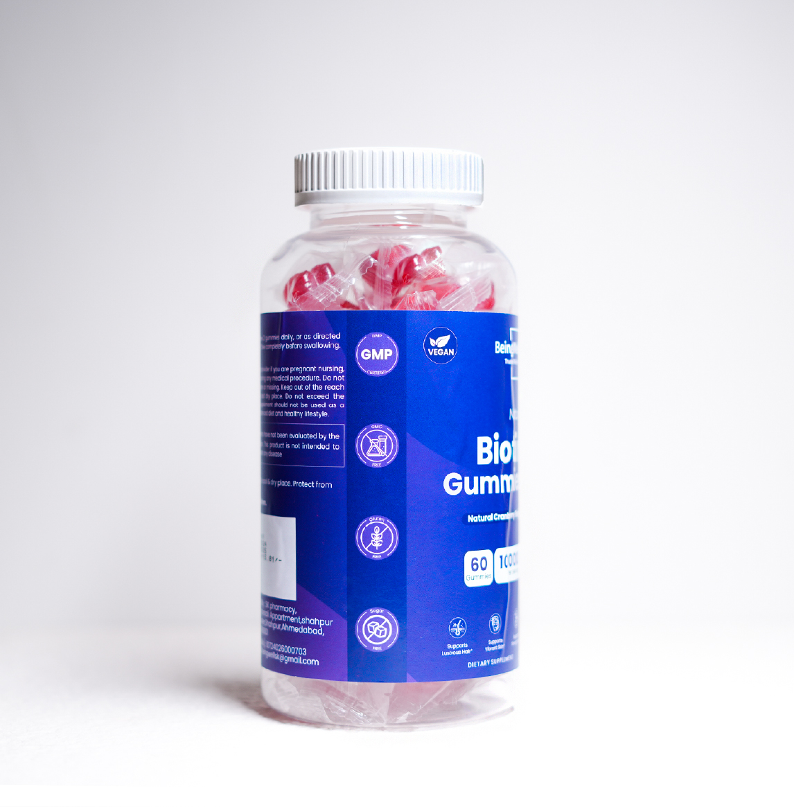 Description: Being Well Biotin Gummies for lustrous hair, vibrant skin, and strong nails. This 30-day pack is enriched with biotin, vitamin C, B6, B5, zinc, pumpkin seed, bringraj, satavari, and Amla. These gummies come in a natural cranberry flavor and are both gluten-free and sugar-free.